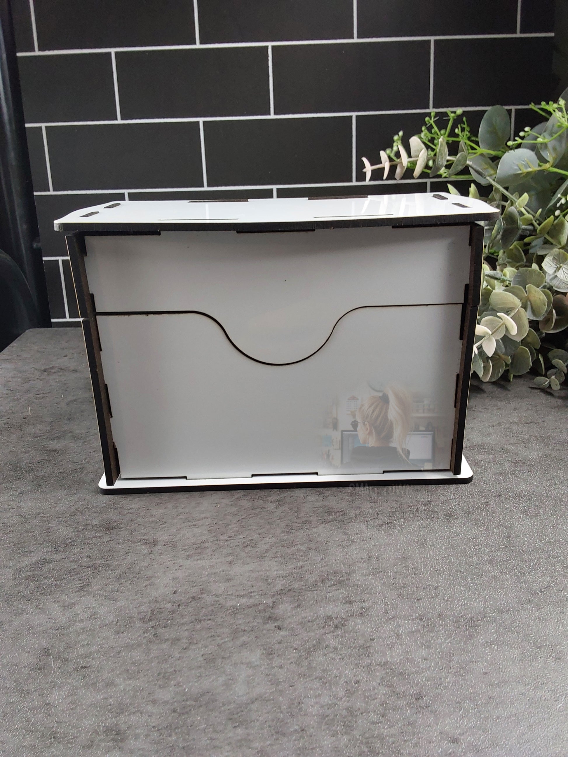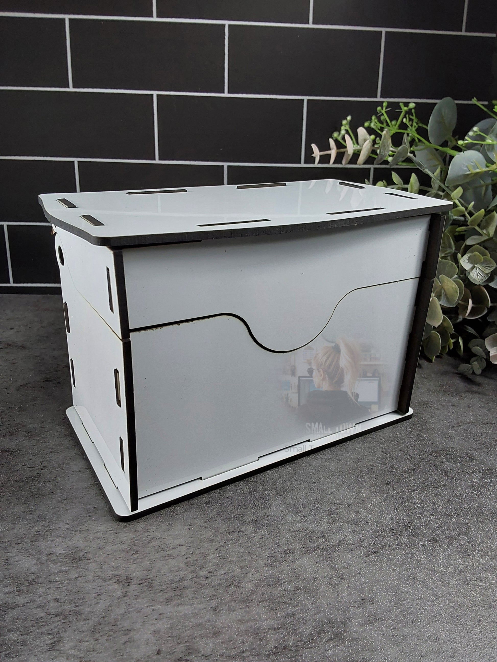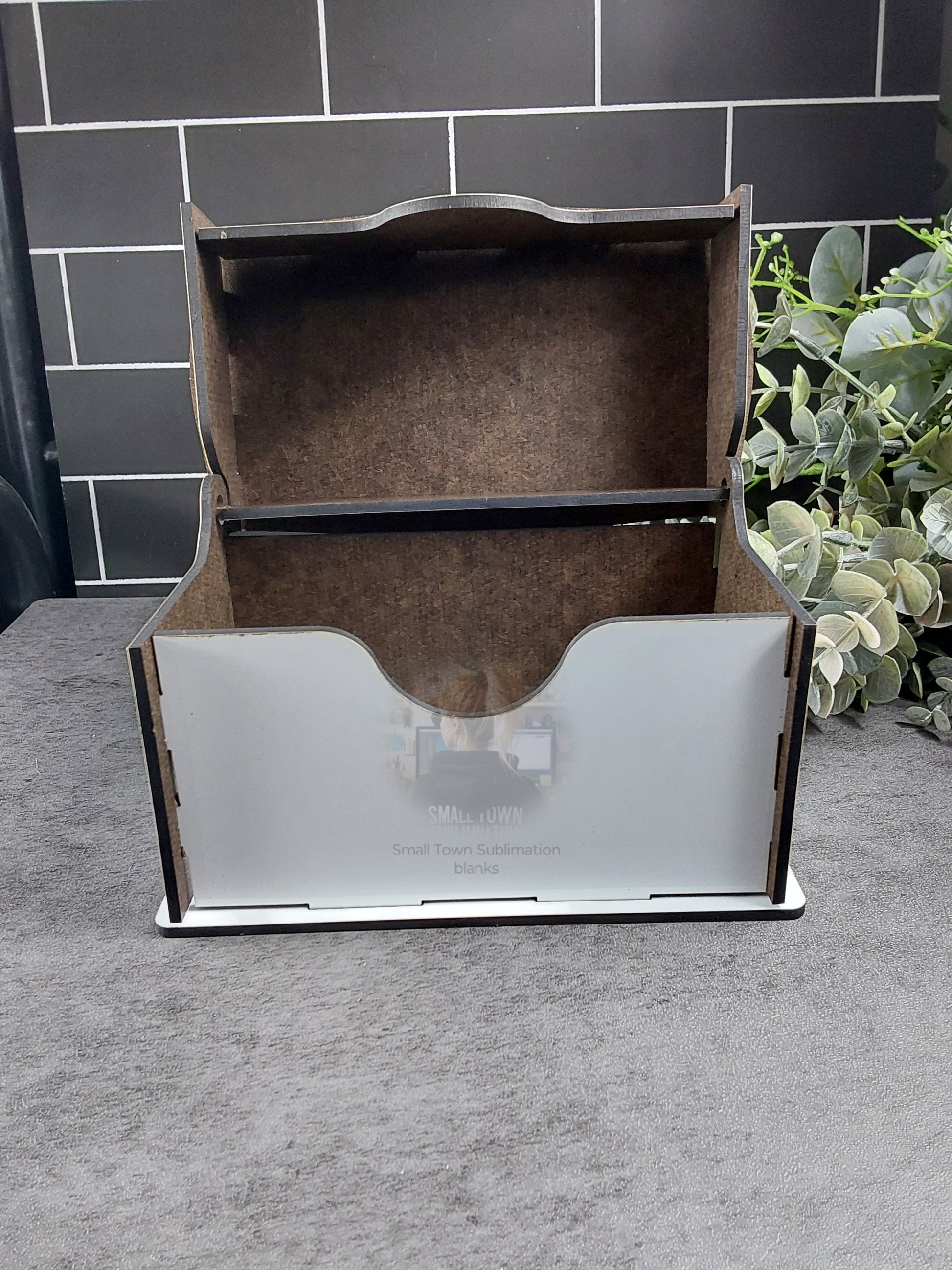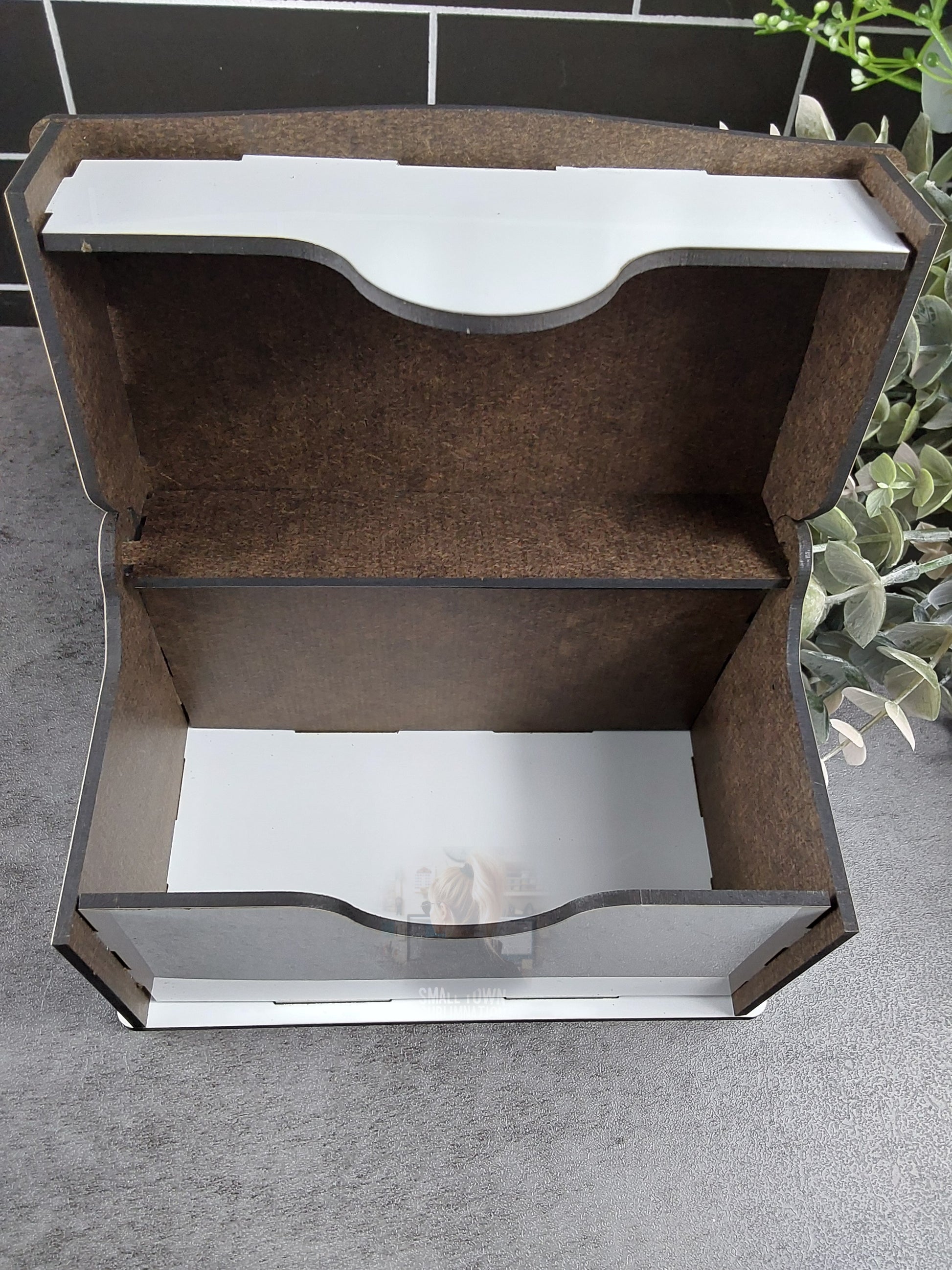Box top flips open as shown in the pictures. Big enough to hold index cards.