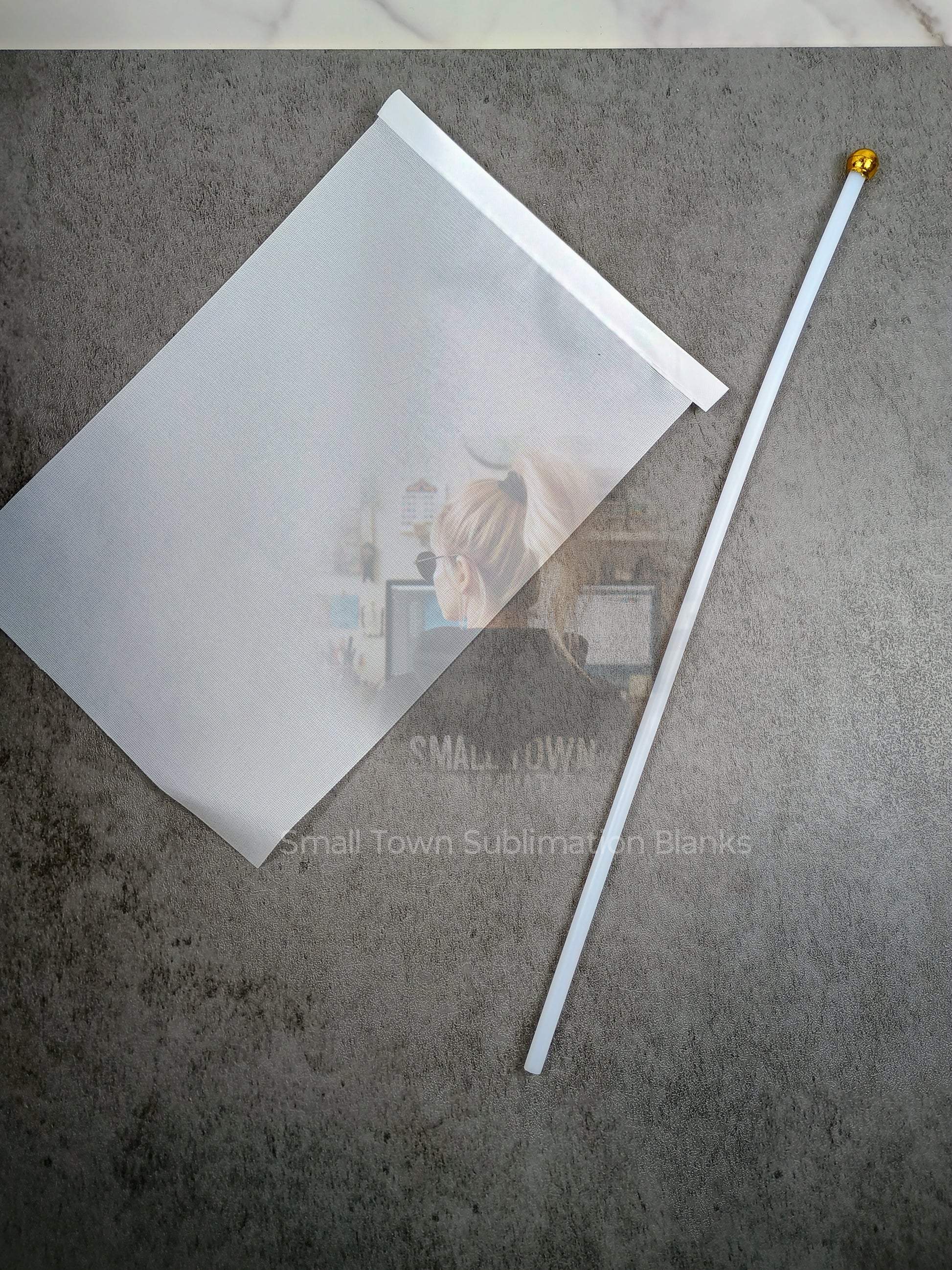 Flag stick is plastic and slides down in the side of the flag once sublimated