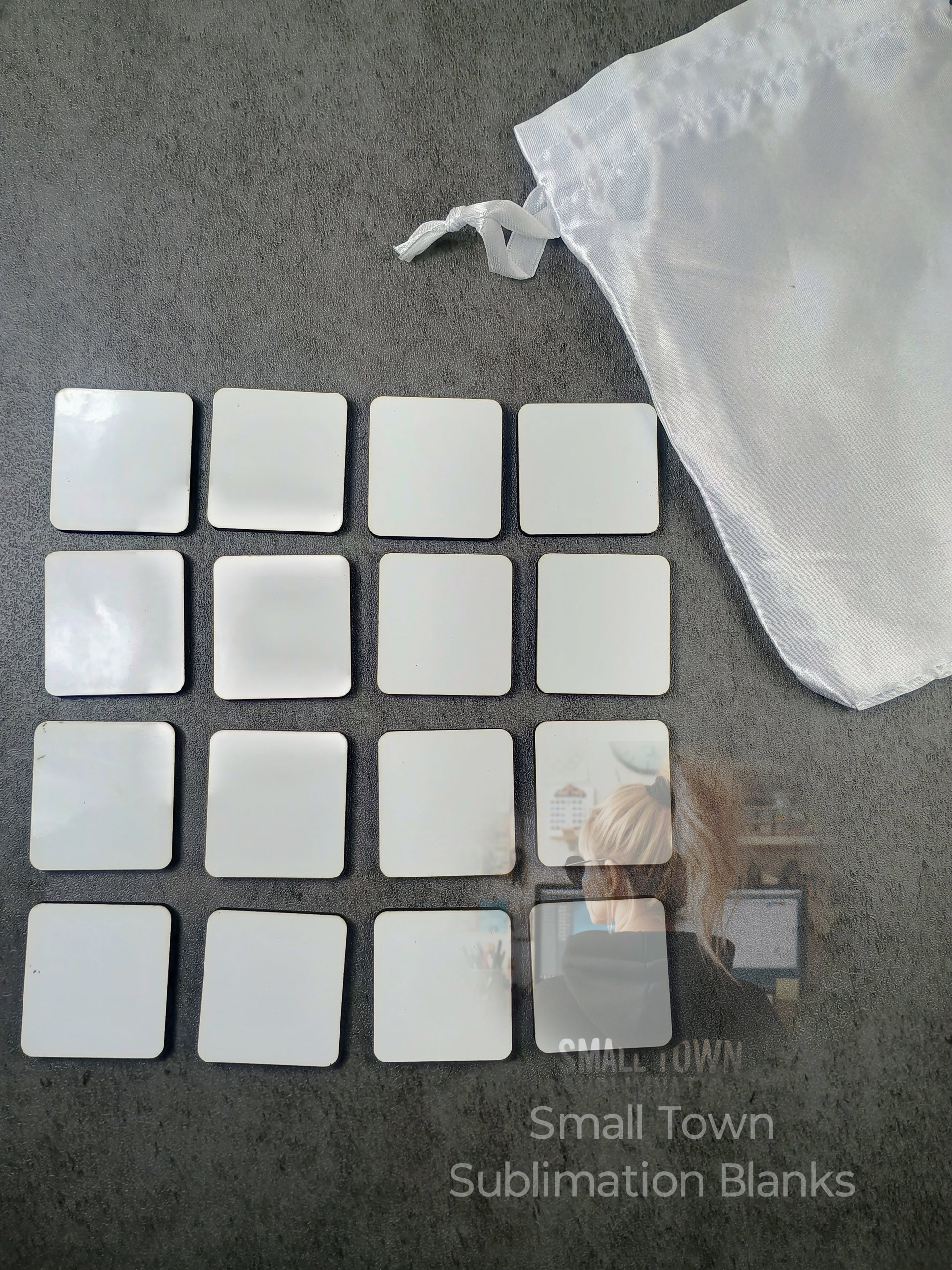 16 tiles and comes with a silk pull string bags that is also sublimatable!