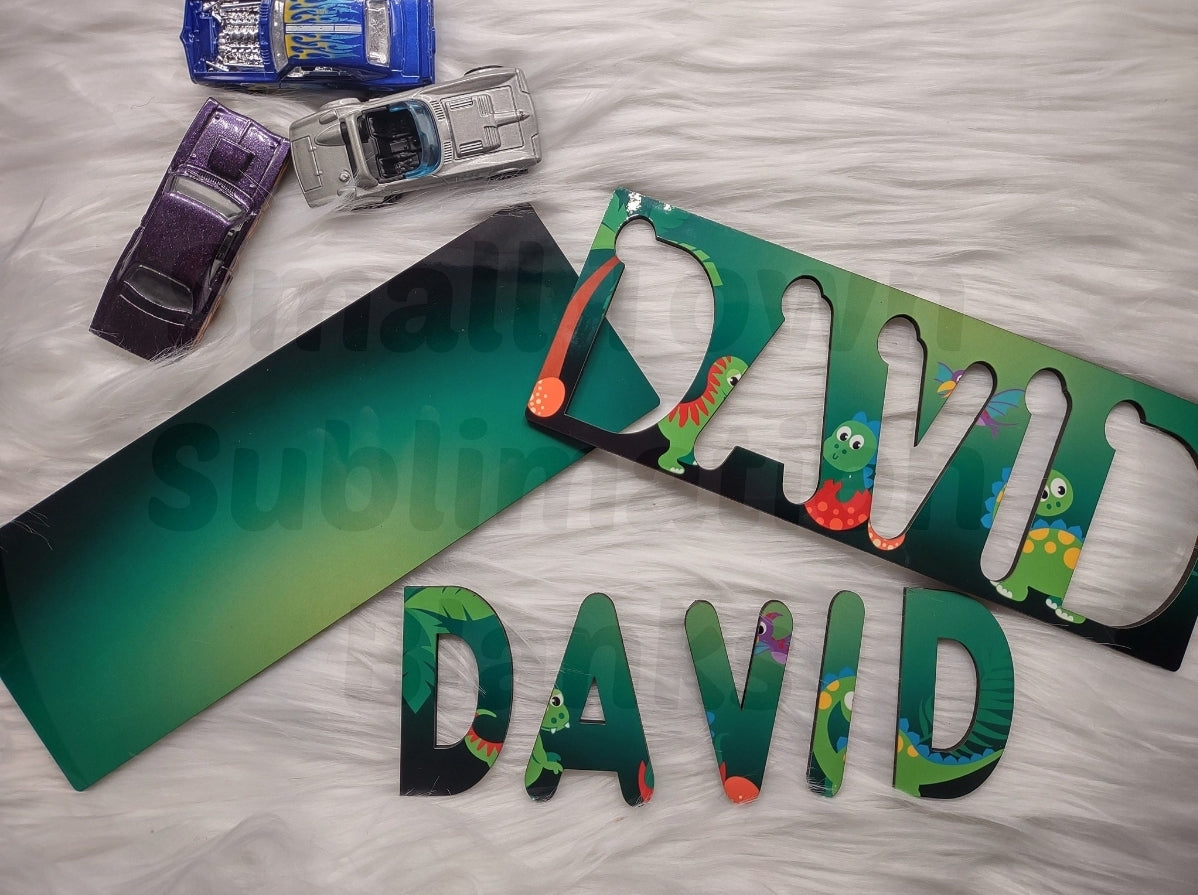All parts are sublimatable! Back solid plate and top layer with letters cut out and then the letters. Finish off after sublimating by glue around the edges to put together.