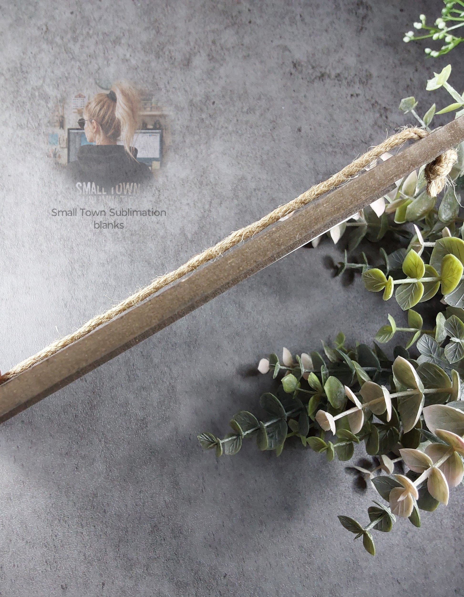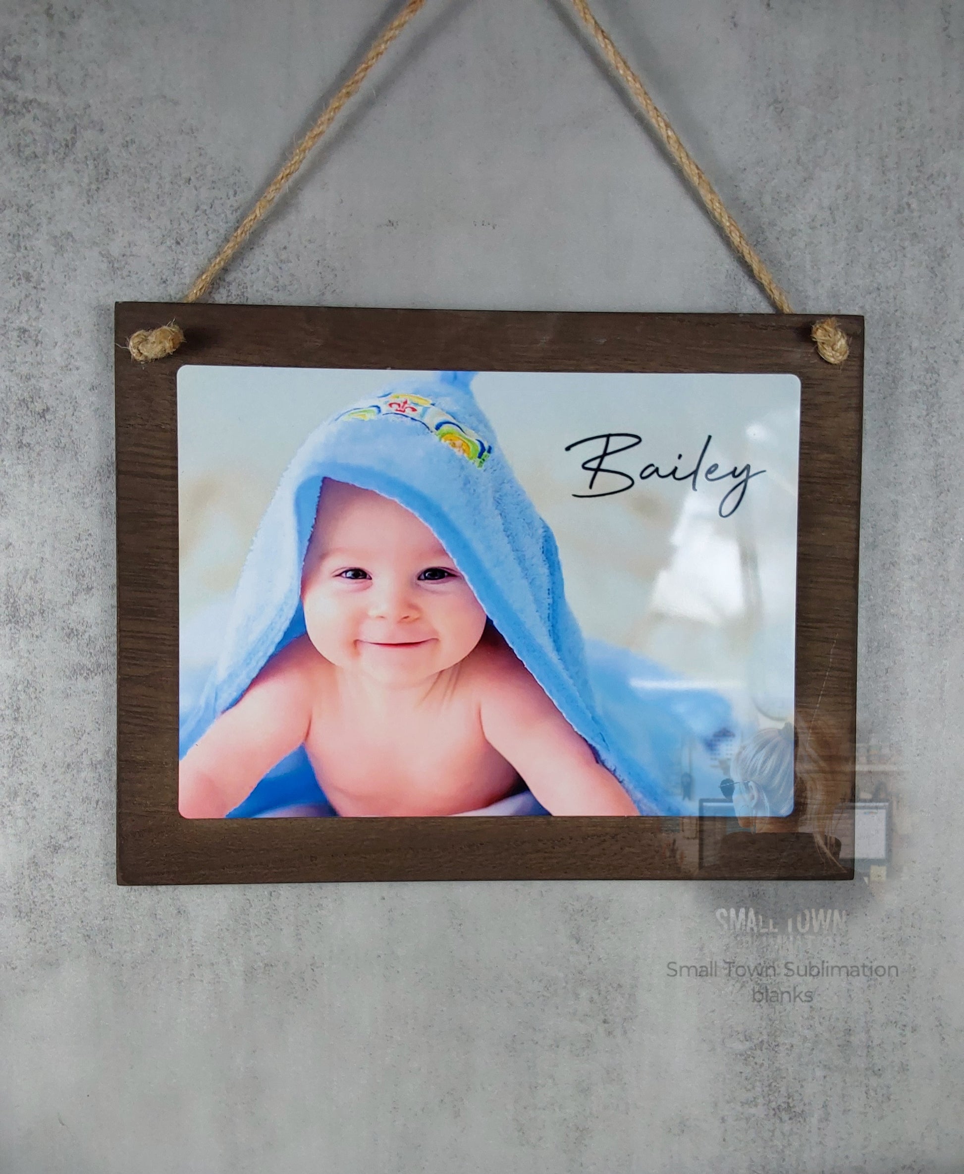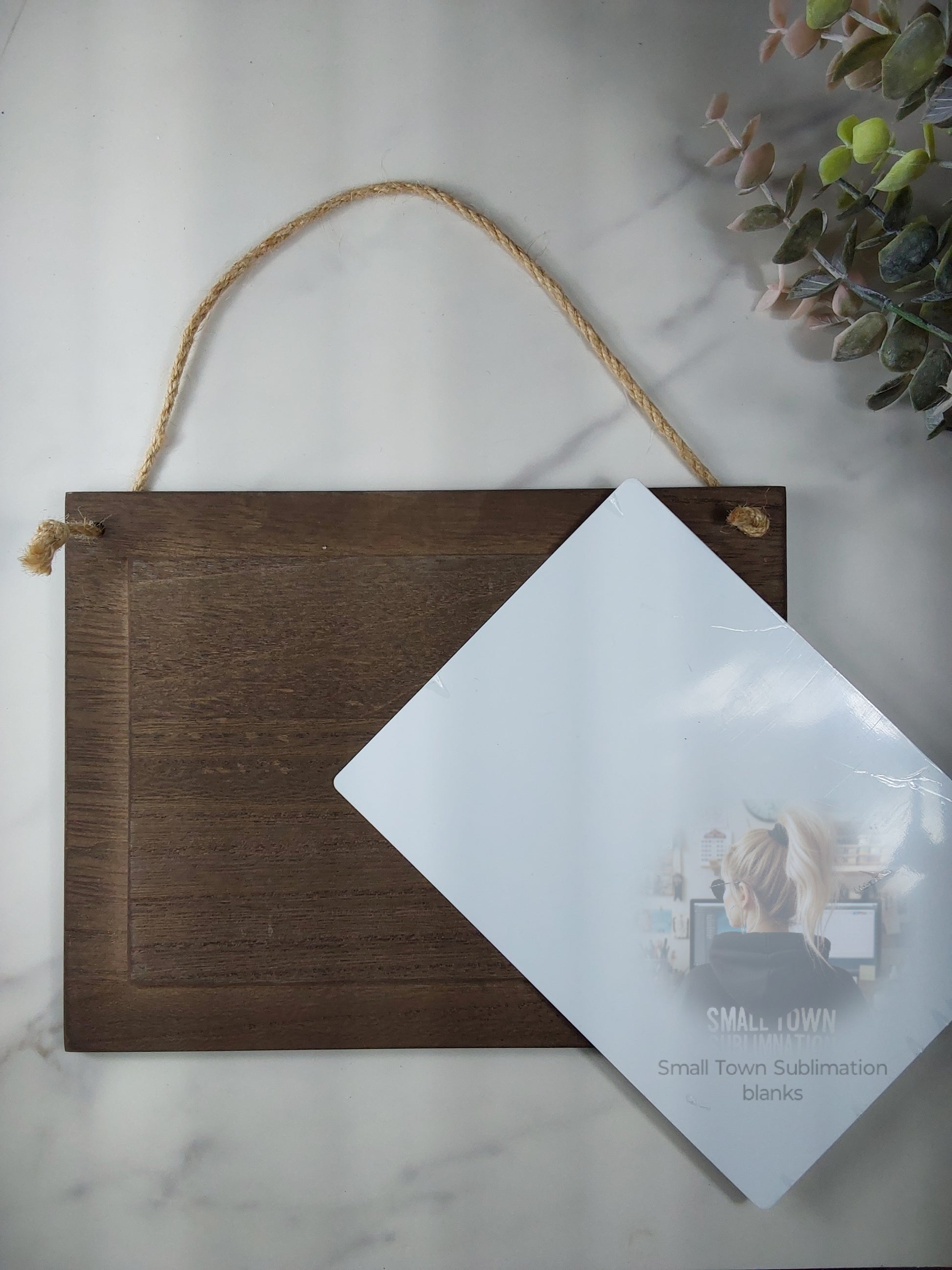 Comes with aluminum sheet to sublimate on. Will need to glue it in place when finished. Dark Natural wood